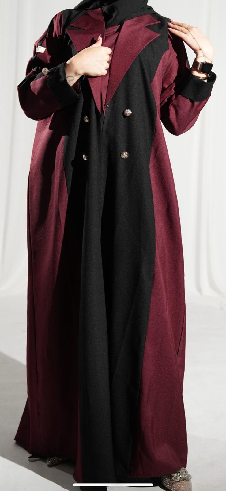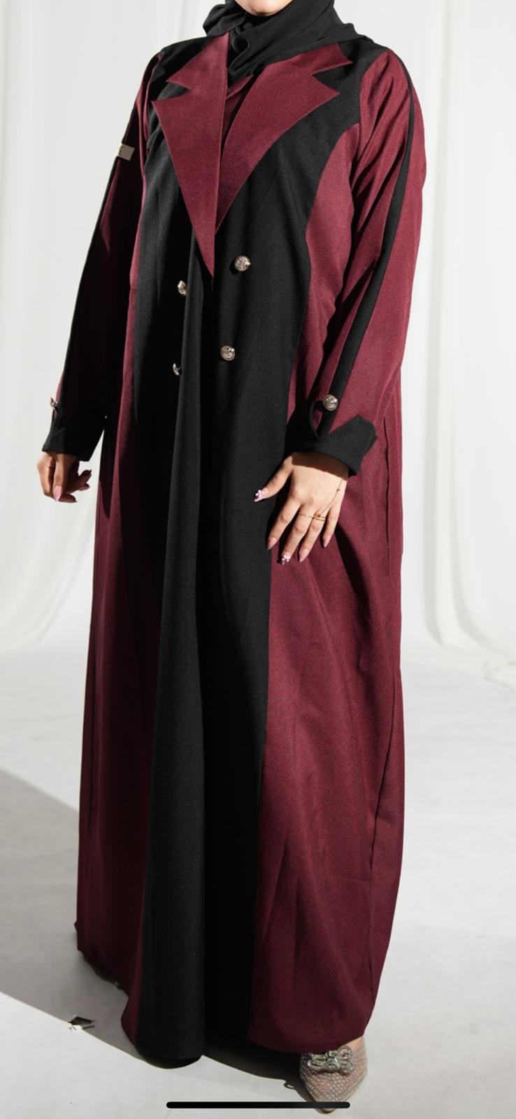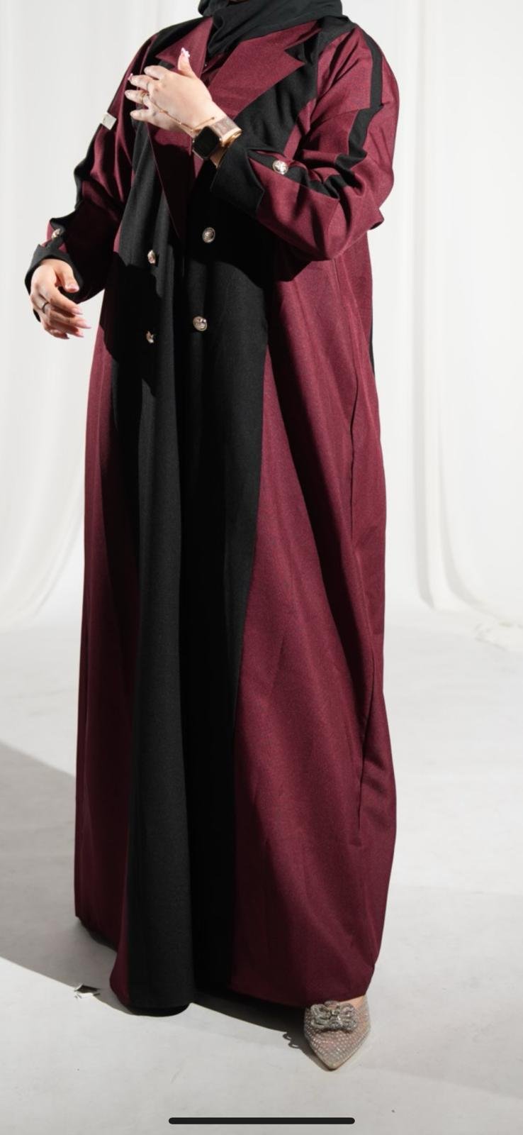 عباية أنيقة بتصميم كلاسيكي بلمسة عصرية، تتميز بلون خمري فاخر مع تداخلات سوداء جذابة تضيف طابع فخم وراقي. مزودة بأزرار معدنية أنيقة على الأمام والأكمام لإطلالة مرتبة واحترافية. قصتها مريحة وانسيابية، مثالية للمناسبات الرسمية واليومية.