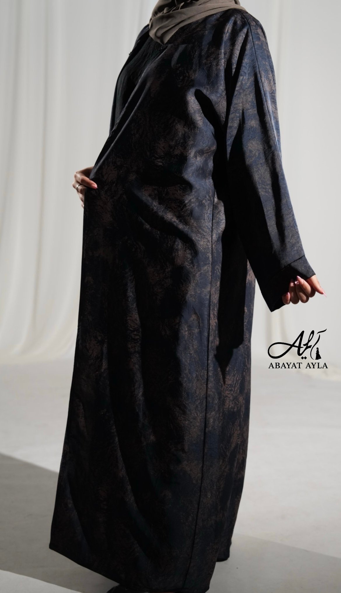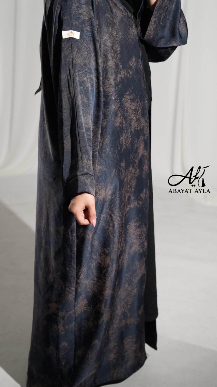 عباية أنيقة بتصميم واسع، قماشها كحلي مطبوع بنقشة دخانية فاخرة بلمسة لامعة خفيفة، تعطي مظهر راقٍ وملفت