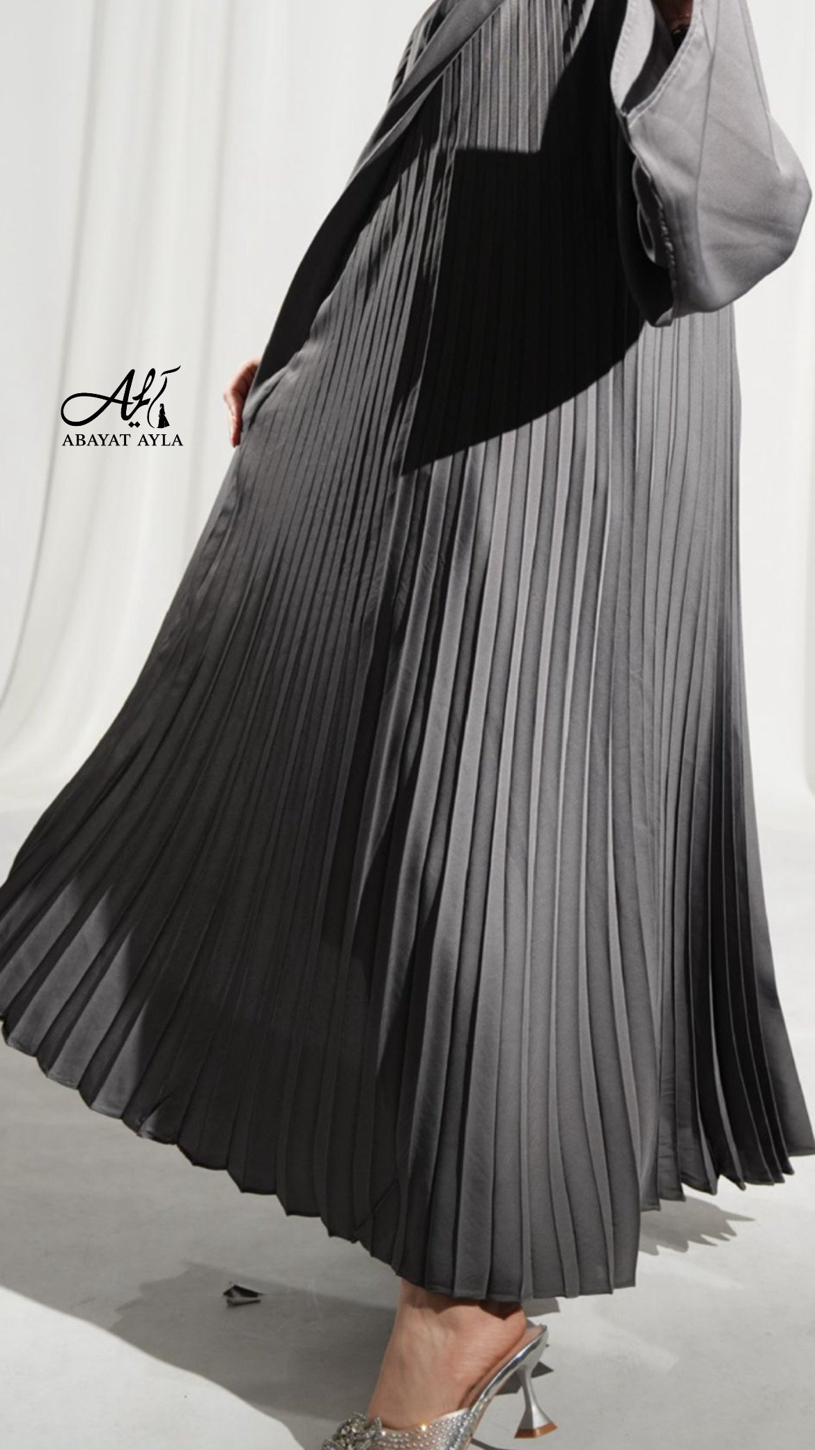 عباية بليسيه أنيقة بلون رمادي غامق، بتصميم واسع وانسيابي، تميّزها الطيات الطولية التي تمنحها لمسة عصرية راقية.