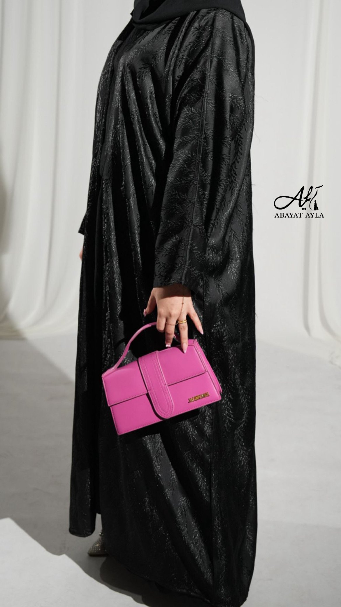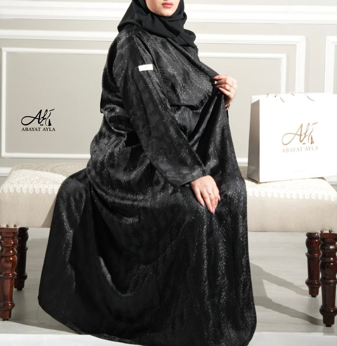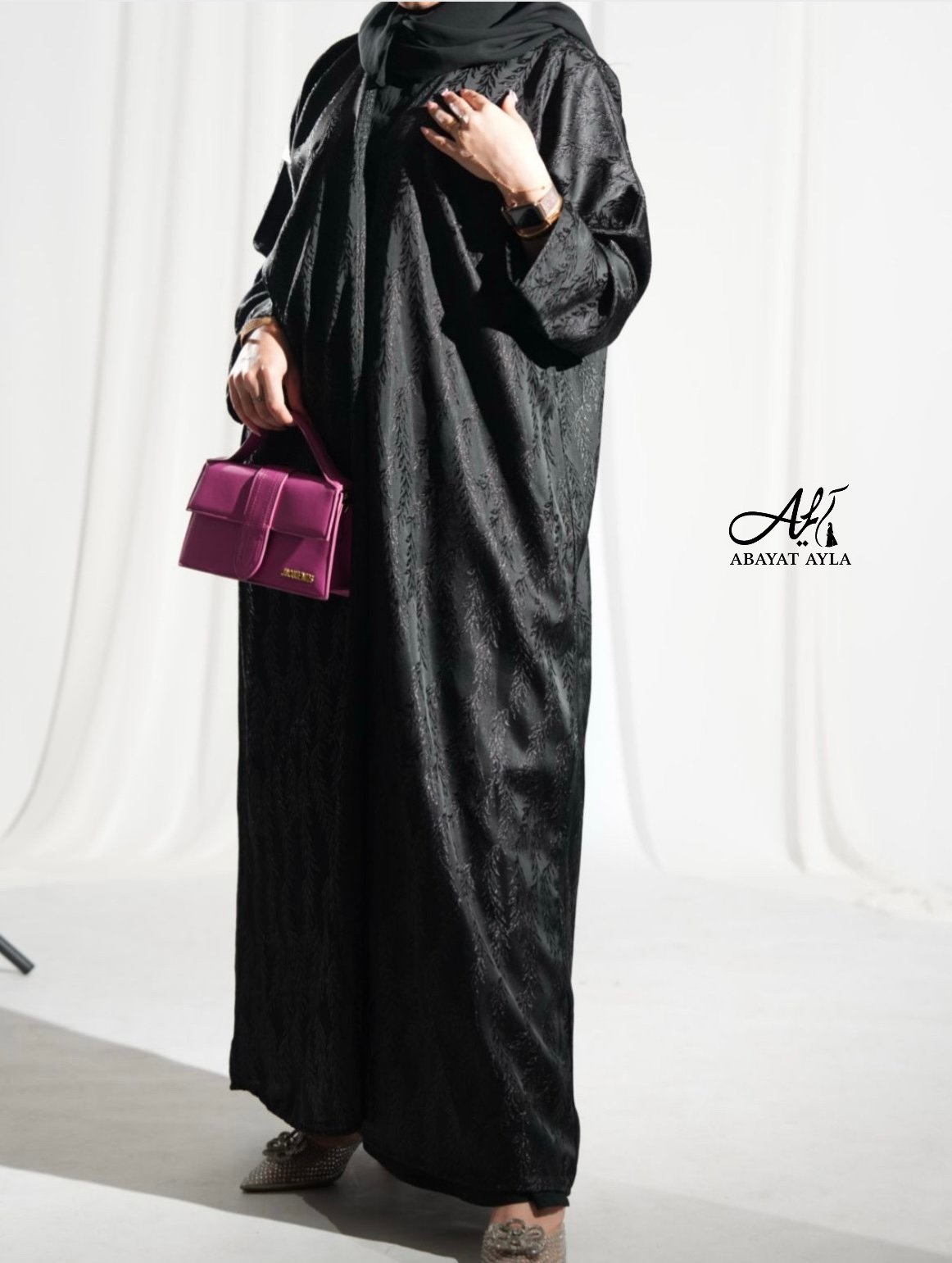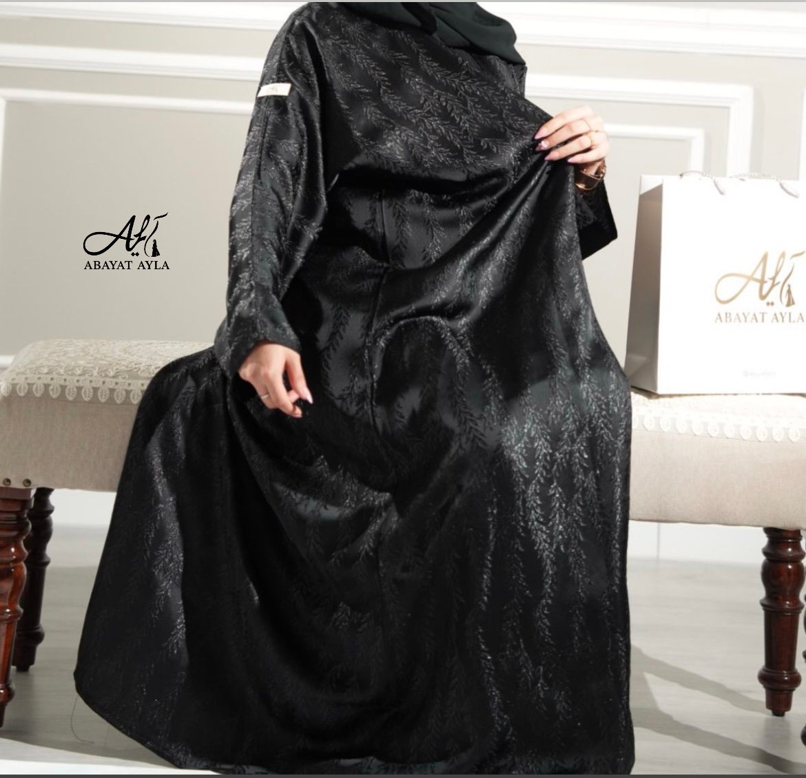 عباية فاخرة من قماش لامع أسود بنقشة ناعمة وراقية تشبه أوراق الأشجار، تضيف لمسة أنثوية أنيقة. القماش يعكس الإضاءة بشكل جذاب، مما يجعلها مثالية للمناسبات المسائية والرسمية. التصميم كلاسيكي وانسيابي مع لمسة عصرية ناعمة.