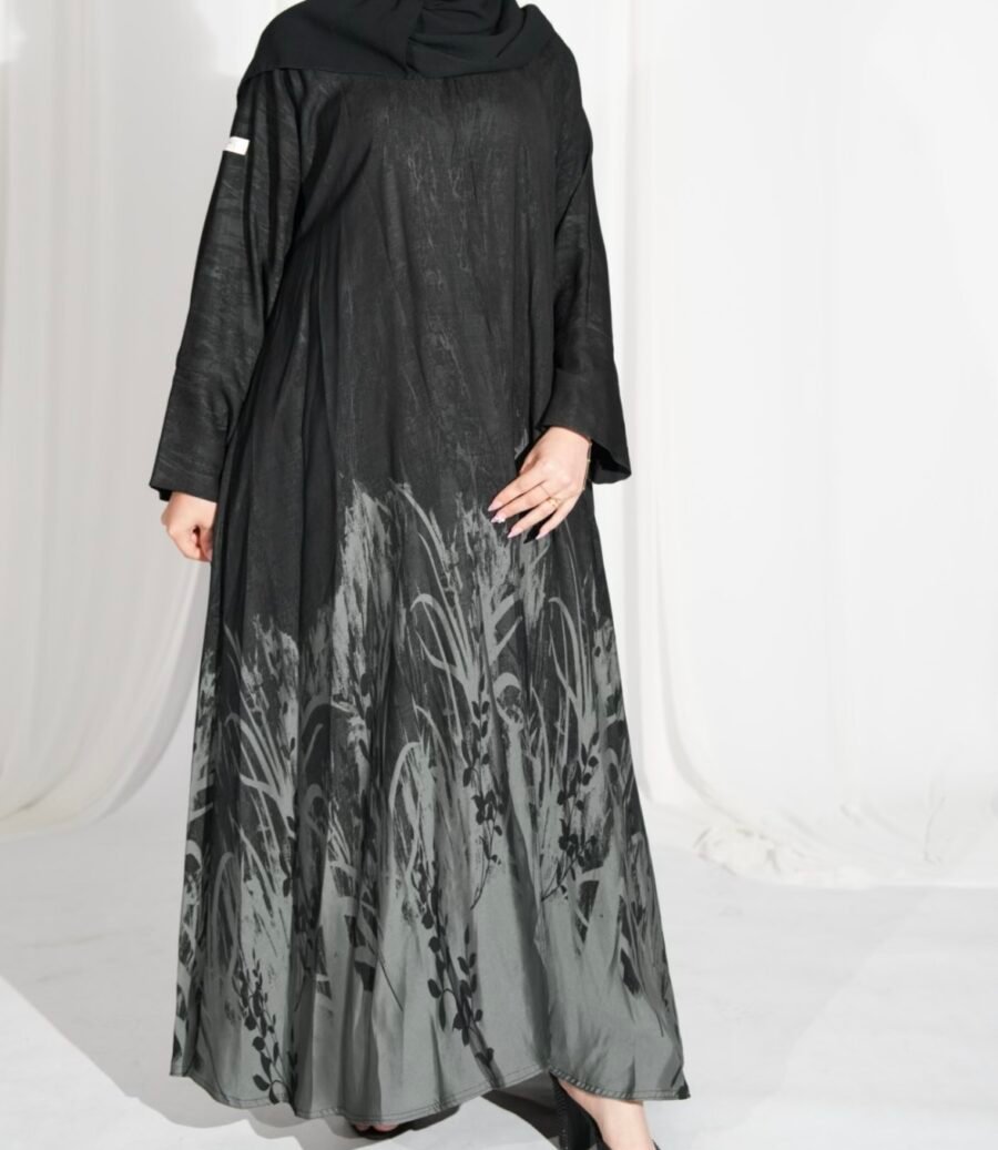 عباية أنيقة باللون الأسود، بتصميم بسيط وواسع، مزيّنة بطبعة فنية باللون الرمادي في الجزء السفلي تعطي لمسة طبيعية ناعمة تشبه الأعشاب أو النباتات، مناسبة للإطلالات اليومية الراقية.